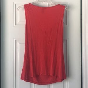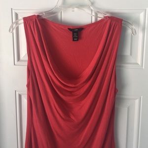 This beautiful red/pink top is perfect for any occasion! It comes in a size medium and it's 95% rayon and 5% spandex. It has an inside lining as well. The last picture makes it look brighter than it actually is because of weird lighting, but it's not as pink as that last picture. It's more similar to the first picture in color. Let me know if you're interested!