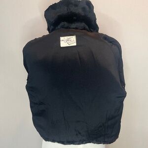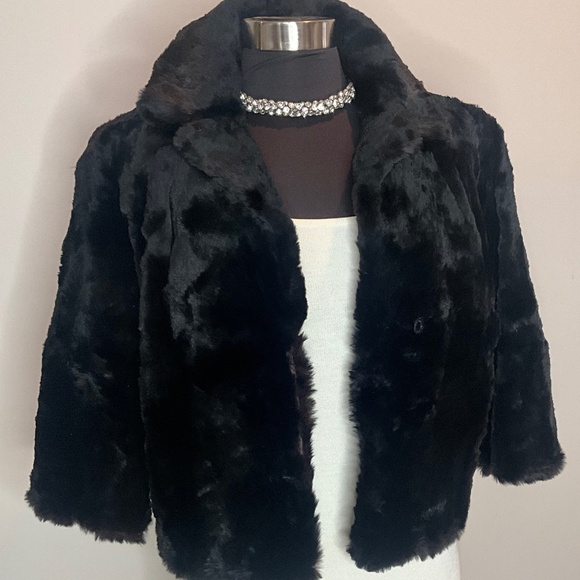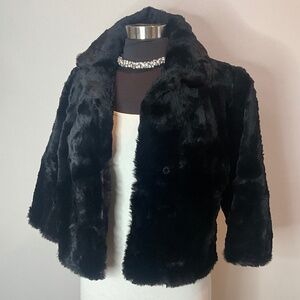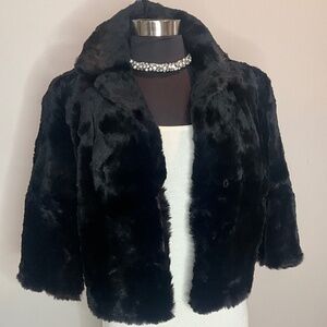 * black real fur cropped jacket with 3/4” sleeves in very nice pre-owned condition.