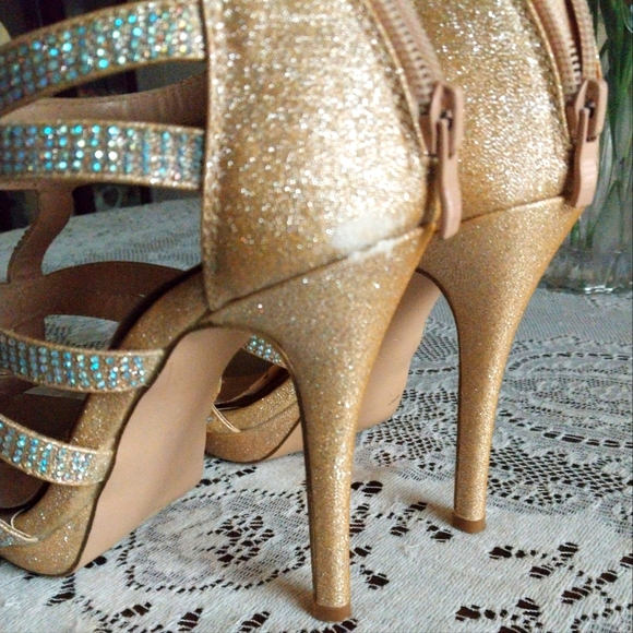 Elevate your style with these stunning glitter strappy heels. Featuring a dazzling gold design, these shoes are perfect for any special occasion. Step out in confidence and shine with every step.