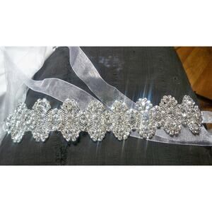 A beautiful heavenly adorned bridal belt. This glittering rhinestone connector is 9.4 inches long and 1.76 inches wide. The shimmering organza ribbons 7/8'' wide and 108 inches long.