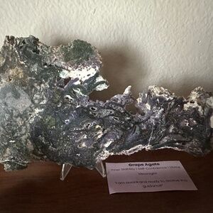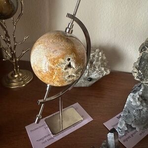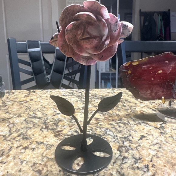 Fantastic rhodonite crystal flower on a stand. Stands 7 inches tall.