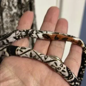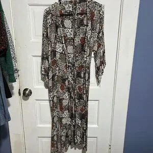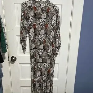 This robe is exquisite, lightweight material, beautiful colors dark brown, tan, cream, comes with tie on inside and a belt for waist shown in pictures.