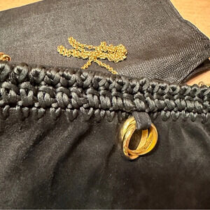 Gorgeous Rodo clutch/handbag in black suede with a gold chain and 3-ring hardware. Dustbag included. 6" x 9.5". Beautiful knotted satin-look ribbon edge... so pretty in person!