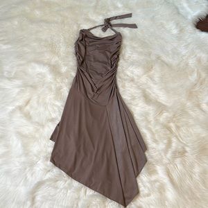 Mocha colored drape collared dress with side rouching. Very flattering. Worn once, like new. Size Medium, fits 6-8.