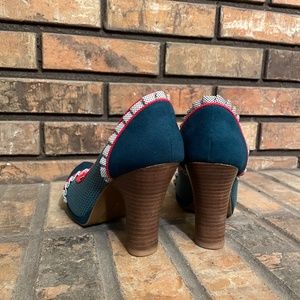 Beautiful 20's era style heels. Suede round toes and a lovely polka dot frill perfect for summer and fall fashions. Stacked Heel. perfect condition