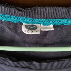 Very cool Roxy long sleeve top with lace detailing on sleeves. I have loved this top but worn only a few times. Good used condition. Faded black color. Purchased at Quicksilver store Laguna Beach 🏝 California.