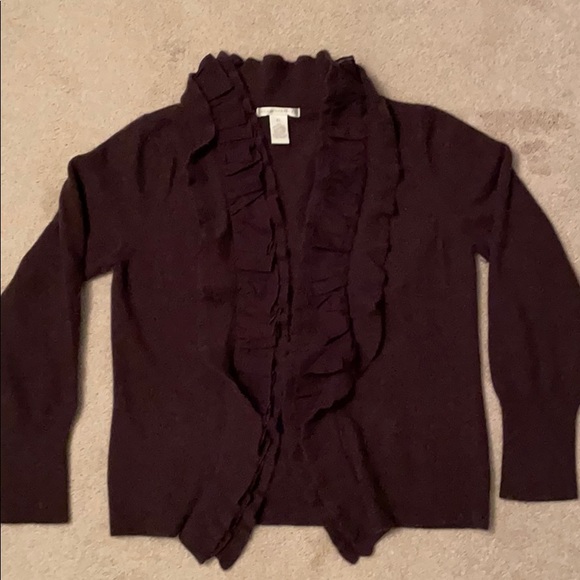 Eggplant purple ruffled lambs wool cardigan sweater. Sized XL but runs more like a Large.
