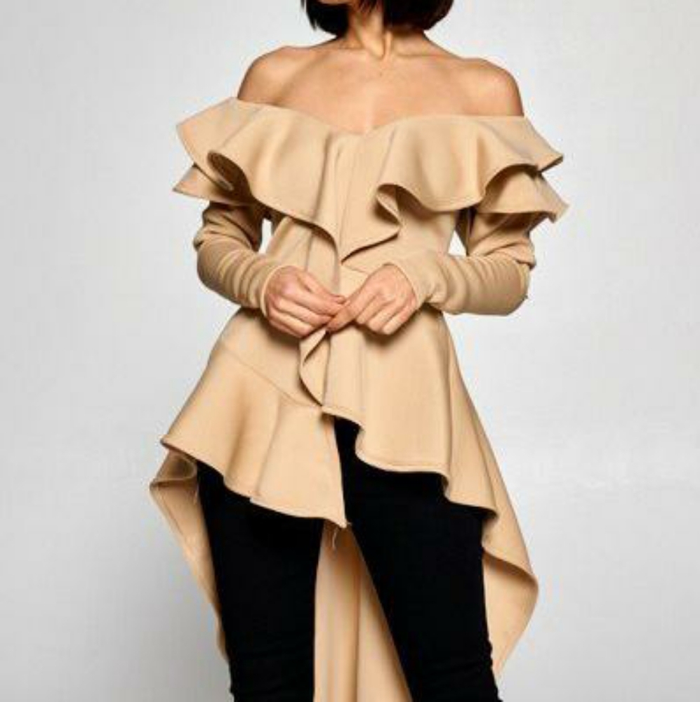 Awesome Ruffle Top with Tuxedo Flair and off the shoulder collar. This Hi/lo chic top is made with a fantastic scuba fabric giving it great shape