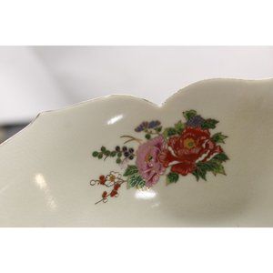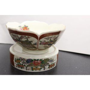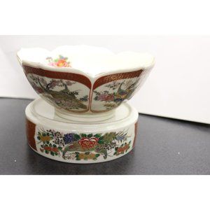 Beautiful 2 piece Lotus bowl and smaller bowl set by Satsuma Japan featuring peacocks and roses. Trimmed with gold. Very nice pre-owned condition. Smoke free dog friendly home. Thanks for visiting my shop today.