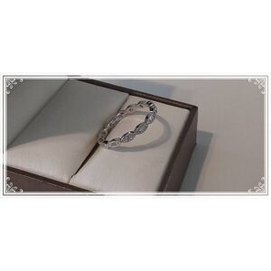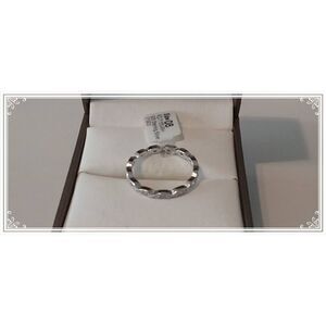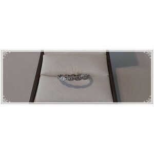 If you love the look of demure elegance, this ring is for you. This eternity band ring is done in a scalloped filigree design and sparkles with shimmering simulated diamonds. The band is done in 925 solid sterling silver and is stamped for authenticity. It is size 8.