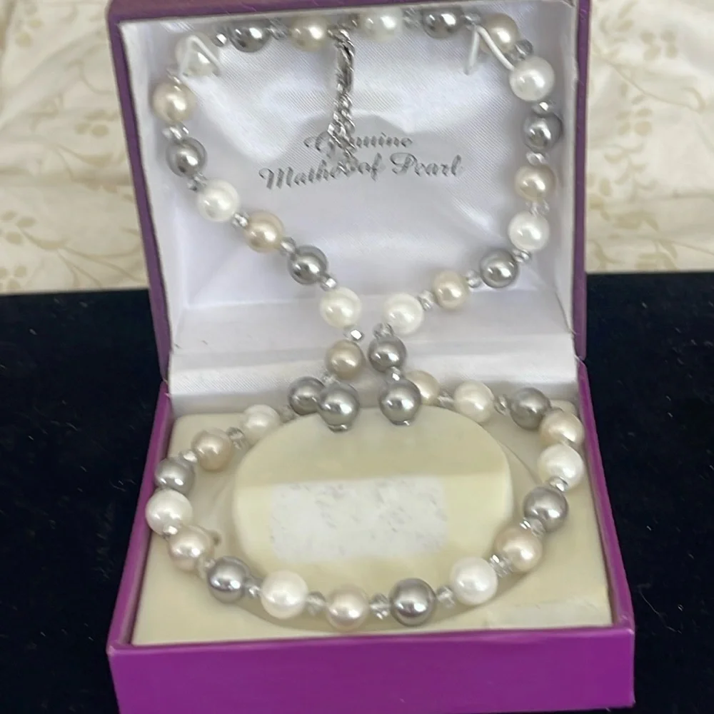 Mother of Pearl necklace and earrings silver plated.