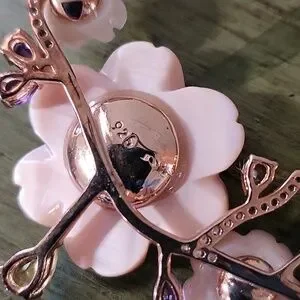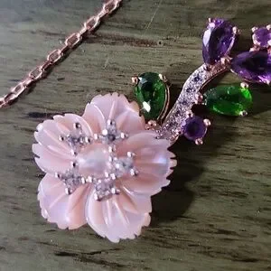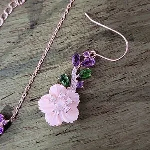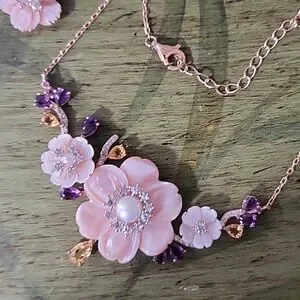 Set of earrings and necklace, genuine carved shell and genuine amethyst, green topaz and citrine. Accented with white topaz and fresh water pearls. 925 sterling silver with 10k rose gold. New never worn. Necklace length is adjustable 18" thru 20" total.