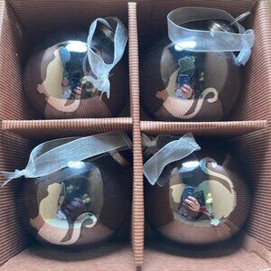 This is a beautiful set of 4 Black Metalic blown glass ornaments with adorable Silzer cats on them. They are 4" Diameter and like new condition in box. They would be perfect to add to your holiday decor, give as gifts and can be used all year long.
