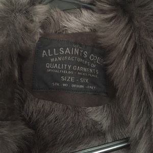 All Saint beautiful shearling coat! all fur inside the coat including the sleeves... Has two side pockets, no zipper it's a buttonlike closure to close it and goes all the way to the neck .... This coat Retail $1500 without tax..Bought it at All Saints NYC soho shopping district......Great condition ... ....Only worn once.....new condition ..will not comment or accept low ball offers .... Color is grey . price is firm or closer sorry ❤ my fave coat