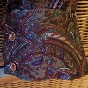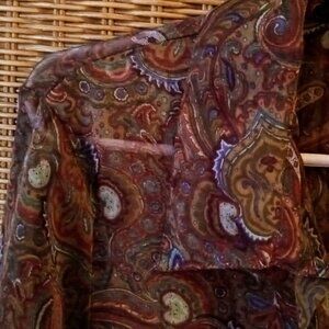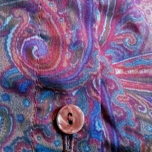 Mint condition! No blemishes. Richly colored paisley print in shades of brown, maroon, purple and blue. This shirt has pretty copper brown buttons down the front. Lightweight sheer fabric with a brushed soft feel. 100% Polyester and machine washable. Size large. Has a casual rich look to it. Elegant but dressed down. Very good condition. I purchased this blouse years ago via Victoria Secret's website/MODA International. Wore only a couple times.