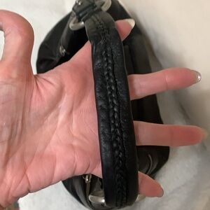Gorgeous Sigmund Olsen leather hobo with Silvertone hardware soft glove, leather zip closure , zip pockets on either side, beautiful bra, work and leather all the way around the top thick heavy shoulder strap inside has one zip pocket two slit pockets