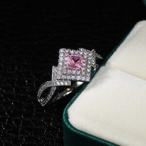 🌸Beautiful Silver Pure Pink Double Layer Weave Princess Cut CZ Ring, K832