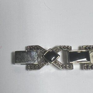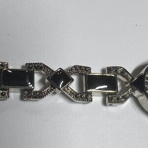 7 1/2" long faux silver watch with black glass stones, band is approx 11mm in width - case is 21X17 mm & has stainless steel back - Very nice and working