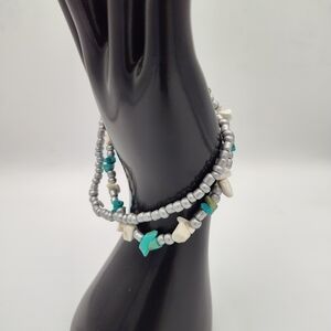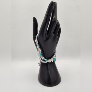 This elegant bracelet features a stunning combination of silver and turquoise beads, perfect for adding a touch of sophistication to any outfit. The intricate design is both stylish and versatile.