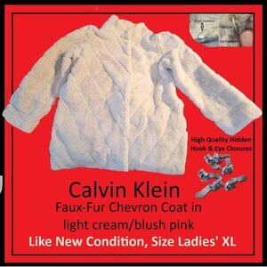 This Beautiful Faux Fur Coat by Calvin Klein gives instant style and class, and can be worn in formal occasions or with jeans. It is soft, luxe look and feel. it is a shade of soft cream/with gentle soft pink overtones, see the kind of blend and color in the detailed pictures. A chic chevron pattern brings added dimension to the Luxe soft faux-fur finish on this. It is pre-owned, but it is brand new condition and appears to have never been worn. Utterly Beautiful