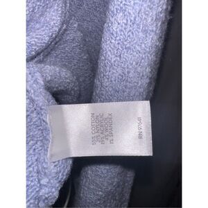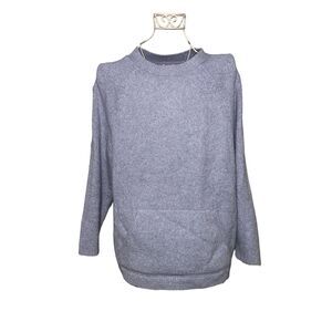 Soft and heavier weight wool blend sweater that has a heathered baby blue colorway. Front kangaroo pocket. Great piece for layering on a cooler day instead of a jacket or wear for lounging around in front of the fire.