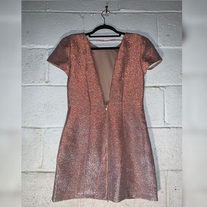 Shiny Pink and Silver Mini Dress! Tight but not Bodycon. Super Cute with Gold Zipper and Strap Across the Open Back! Has Slight Shoulder Pads for Shape!