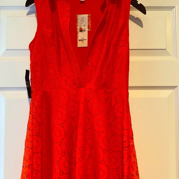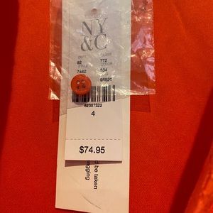 Fun orange spring dress. Falls around my knees on my 5’4 frame. Is a size 4 but fits more like a six. Very well made but not too heavy.