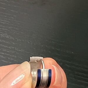 Small Stainless steel and blue inlay huggie hoop earrings.