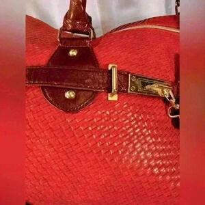 Beautifull Steve Madden Large Duffel Bag, in Stunning Salmon color. Faux leather with brass hardware. Small scuff in vinyl on bottom. Otherwise in excellent condition. Make me a fair offer .