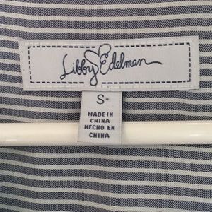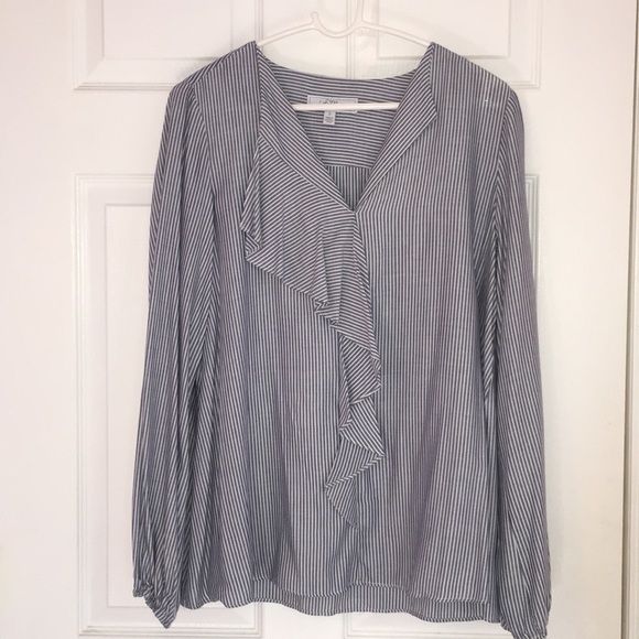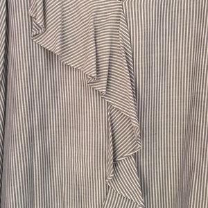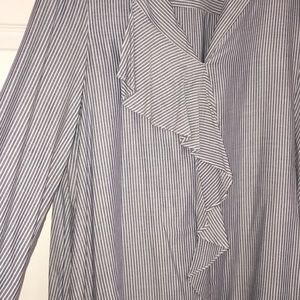 Oversized Nautical inspired blue and white striped top, with a V neck and ruffle along the middle. Can be Dressed up or down. A size small but fits like a medium/large. Light weight material!