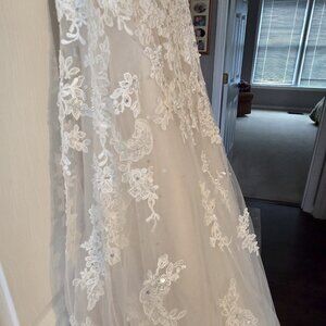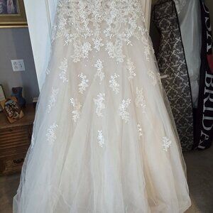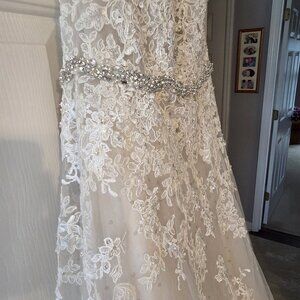Size 14 (fits more like a 10), in excellent condition, worn once, strapless and heavy so it falls beautifully on the hips and no bra required! Lace up back can be adjusted to fit size. Absolutely stunning! Lace over white with a slight hint of pink/rose hue