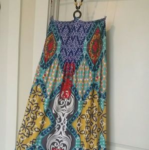 Fabulous Strapless/Sleeveless Printed knit Maxi Sundress with necklace attached. Fits sizes 20-24 This dress is very comfortable and commands attention!