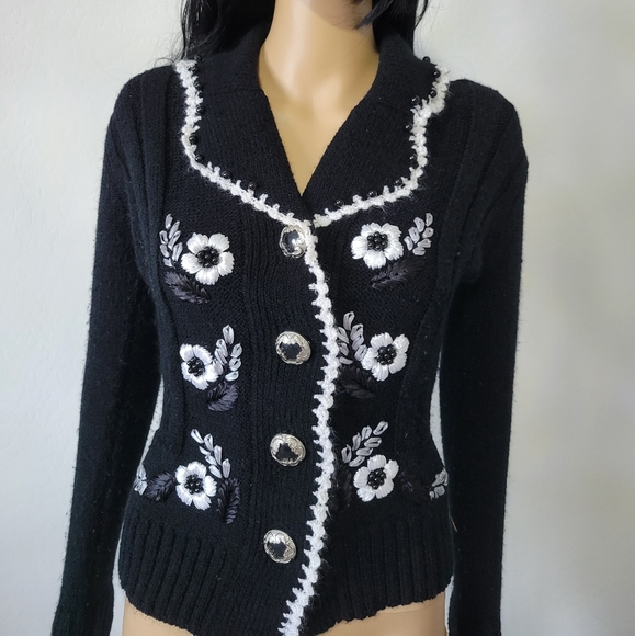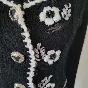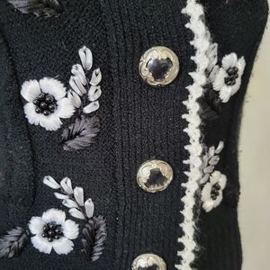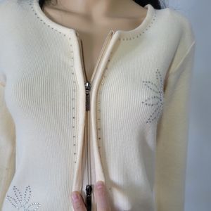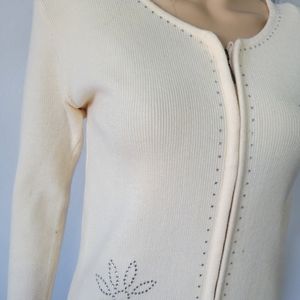 beautiful cream and black small size sweater,the cream one's zipper works two ways ,it can go from top to bottom or from bottom to top ,it's like excellent condition,never used just got 2 dotted stains in moving but hard to notice ,you can see in last picture