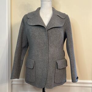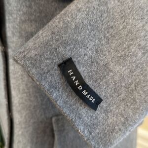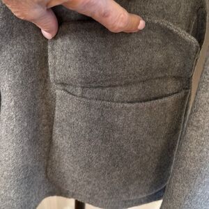 Soft gray felted wool. Pretty shawl collar, hidden snap close. Two deep pockets. I did not wear with a belt, and I can’t remember if it came with one when I bought it. Looks amazing and classy with jeans and boots.