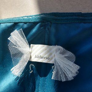 Beautiful Teal strapless dress, soft pleated fabric detail on bodice, teal grosgrain belt, bodice is lined with boning and padding in bust for support. Armpit to armpit dress measures 16 1/2" flat, shown on a size 8 dress form (bust 34 1/2", waist 25", hip 35 1/2") Brand is called hitherto, was worn once as a bridesmaid dress