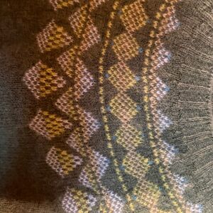 So pretty and different for winter! The barely worn sweater is in a spring green with a yellow, white and sky blue pattern around the yoke. Size medium.