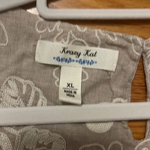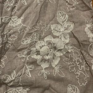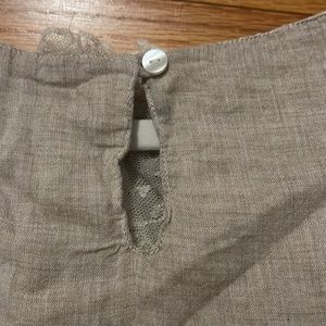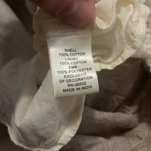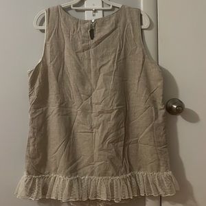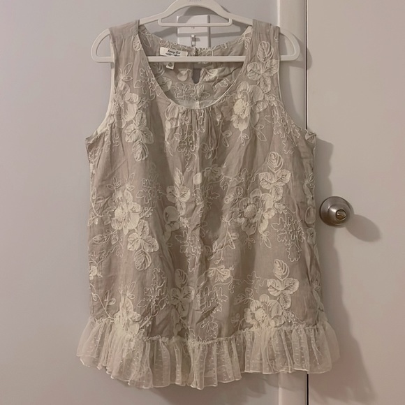 Beige/tan sleeveless top with cream embroidered flowers and ruffle on bottom. Fully lined.