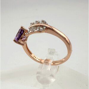 Fun and fanciful Amethyst Arrow Ring. Purple and white Lab Created Gemstones forming an arrow around the finger. Sterling Silver with 14kt rose gold overlay.