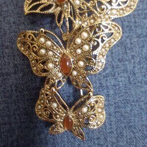 Butterfly Brooch. Three delicate butterflies in ascending size. Gold tone filigree framework showcasing simulated marquis shaped carnelian cabochon bellies and delicate inset seed pearls adorning the delicate detailed wings.