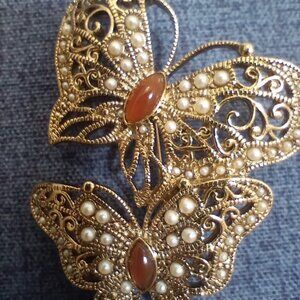 Beautiful Triple Butterfly Brooch Gold Filigree Carnelian Seed Pearl