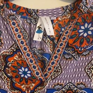 Reposhing. It fits more like a M Medium or L Large than an XL. The tag says it is an XL. Beautiful tunic length top, exotic print of purple, orange and blue. I wish it fit! Excellent condition. Pair with pants for a cute and unique business casual look.