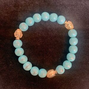 Beautiful turquoise beaded bracelet with 3 gold tone metallic Buddha beads.