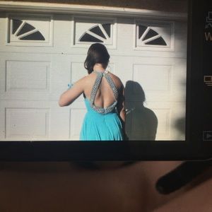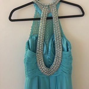 My dream come true Cinderella dress!! Beaded around chest and straps that go around the neck to an open back! I built in pads for boobs. Top heavy on hanger but unnoticeable when worn.