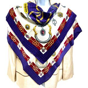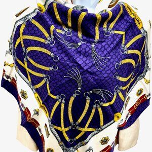 Beautiful TRUSSARDI 100% silk scarf satin is a stunning and luxurious accessory piece perfect for any outfit. The jewelry rope chain pattern and vibrant purple ivery burgay gold gold gray color add a touch of elegance to any attire, while the high-quality silk material ensures a luxurious feel. With its vintage appeal and Italian craftsmanship, this square 34"x 34" scarf is a versatile and stylish addition to any wardrobe.