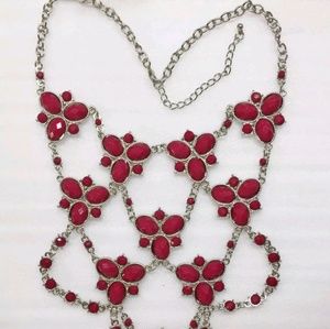 This is a gorgeous necklace. Even prettier in person. You will get many compliments with this necklace. It is a cranberry colored faceted silvertone 25 inch (total) necklace. Size shows in pics. Vintage. Very little wear.