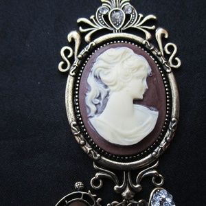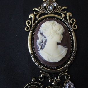 A very unique Victorian style cameo necklace with long chain. The cameo is set in a metal pendant accented with filigree design and crystal stones. Two heart charms ascend at the bottom with a metal rose. I lovely piece to wear for a Victorian costume or steampunk outfit. The chain measures 12" long. The cameo is 1.5" and the entire pendant is 3". A truly lovely piece