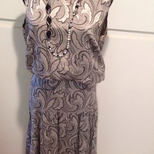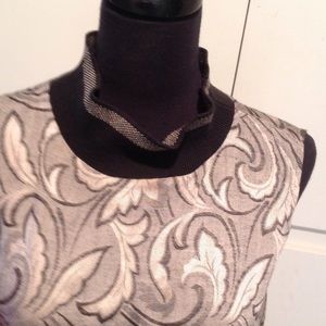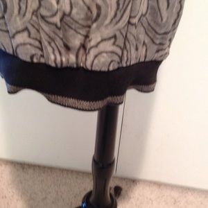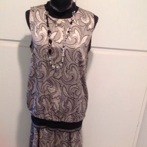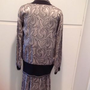 Suit by Melrose. Vintage with a 20's, 30's look 34" long skirt, 17" elastic waistband (needs new elastic) sleeveless shell is 27" long with black ribbing at waistline and neck. Jacket is 29" long with black ribbing on front placket and waist. Abalone buttons. Ribbing is stretched out but still wearable