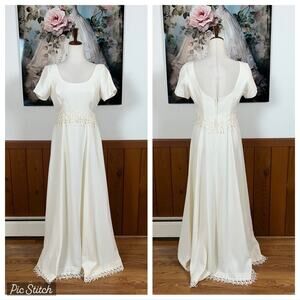 This elegant cream wedding dress features delicate lace detailing, perfect for your special day. The soft crepe fabric ensures comfort and style. Great condition! Bust measures 38”, waist is 28”, length is 60”