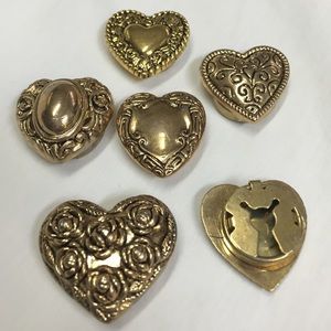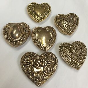 6 heart button covers. Each one is a different style. Guaranteed to make an ordinary button down shirt, or anything with buttons, into something extraordinary!! These are over 30 yrs old, and still look as beautiful as the day I bought them. Thank you for looking, and .... happy Poshing!! 🛍