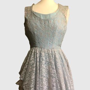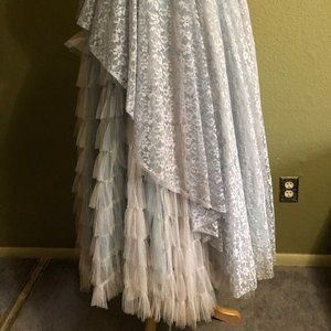 This is a professionally made homemade pale blue vintage Princess dress. This is an old dress, possibly 1950's or older, which means it has some condition issues. The lace has a small tear and there is a small hole in the taffeta (shown in last two photos). Neither can be seen when wearing the dress. The flat measurements are Chest: 15.5", waist: 12", shoulder to waist: 15", waist to hem: 37". This dress is very petite.